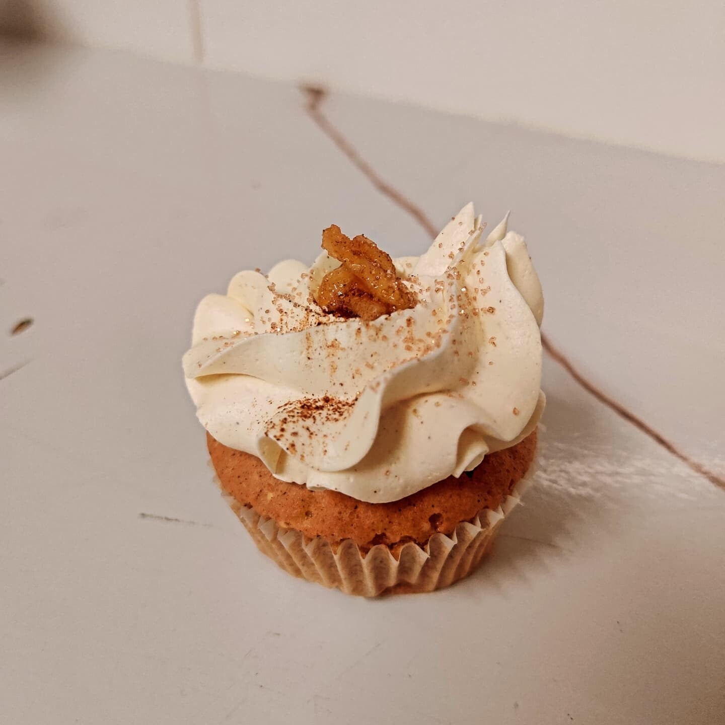 Een cupcake van appelstukjes en kaneel afgewerkt met een kaneelbotercrème en gekarameliseerde appeltjes bovenop.
